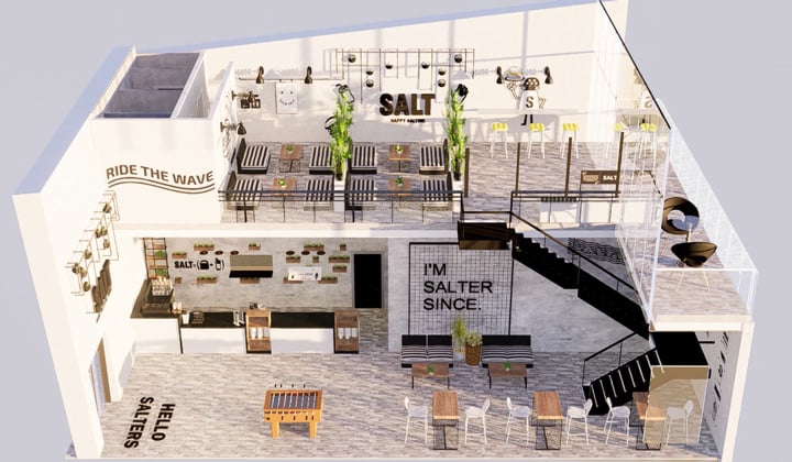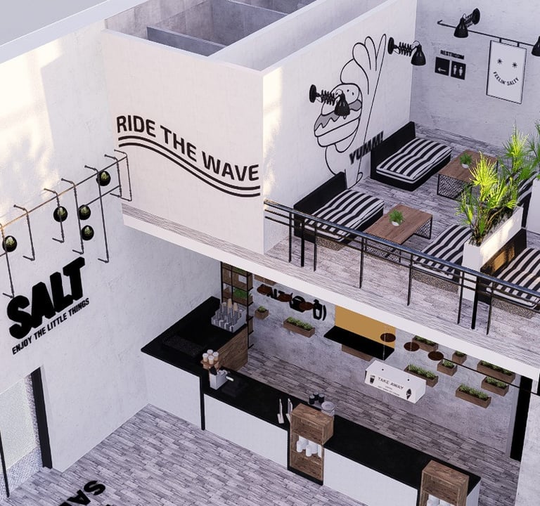 Salt was expanding its branches across the Middle East, with the first location following the launch of our newly developed visual identity opening in Bahrain. The client commissioned an interior design mood board that embodied the brand's essence while incorporating the updated graphic system we had created. I crafted a luxurious industrial mood board to visually translate the brand's core values and collaborated closely with the 3D designer to deliver the final execution.